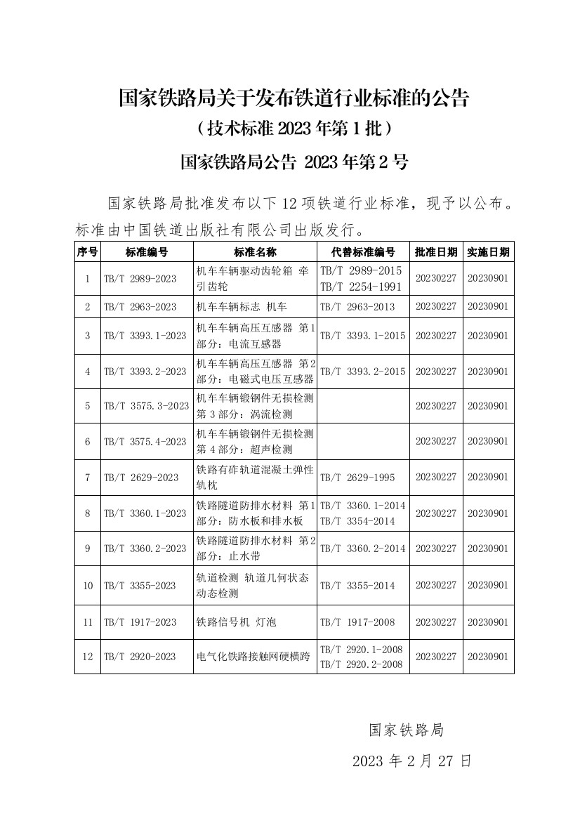 國(guó)家鐵路局關(guān)于發(fā)布鐵道行業(yè)標(biāo)準(zhǔn)的公告(技術(shù)標(biāo)準(zhǔn)2023年第1批)